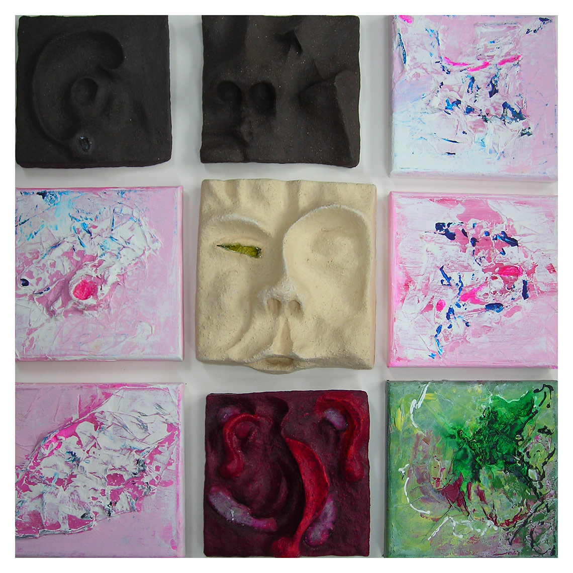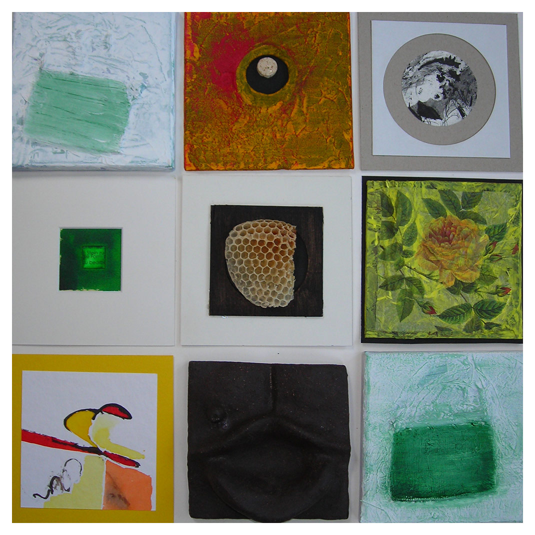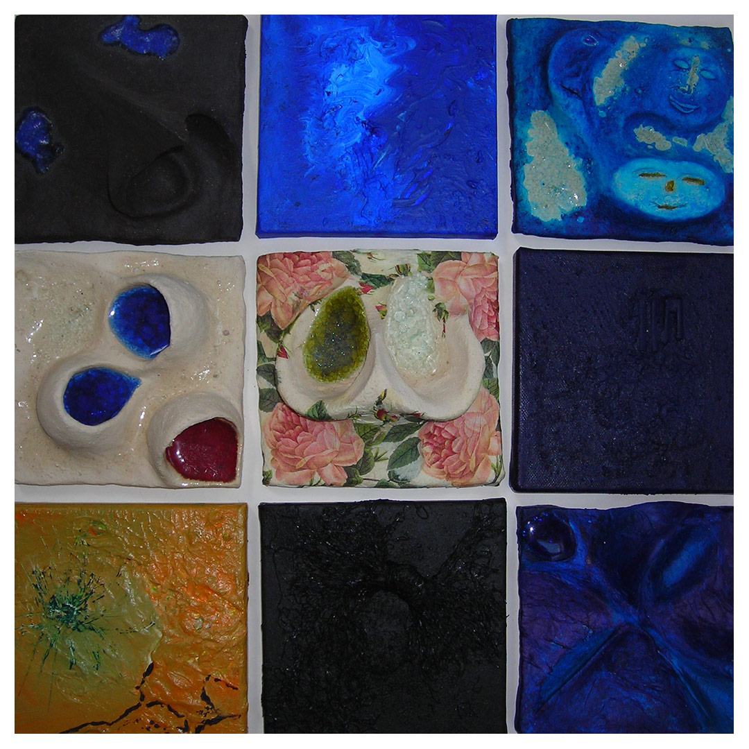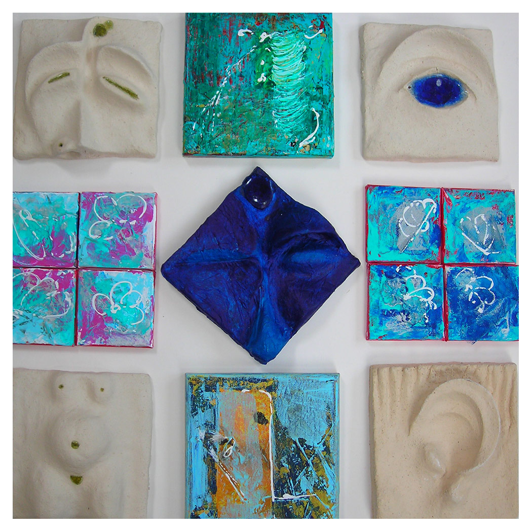Tonkacheln, Papier- und Leinwandbilder, damit soll eine Wand gestaltet werden.