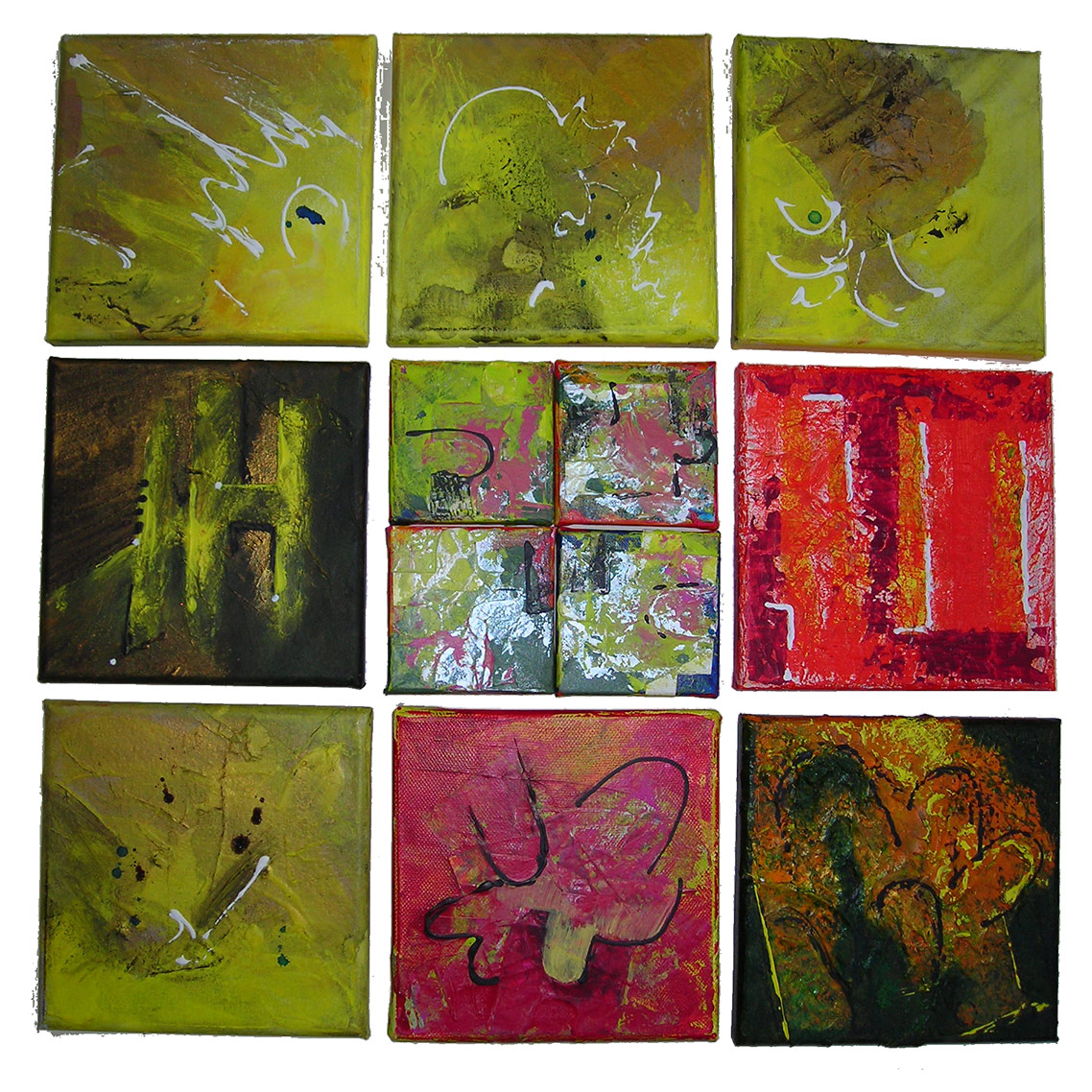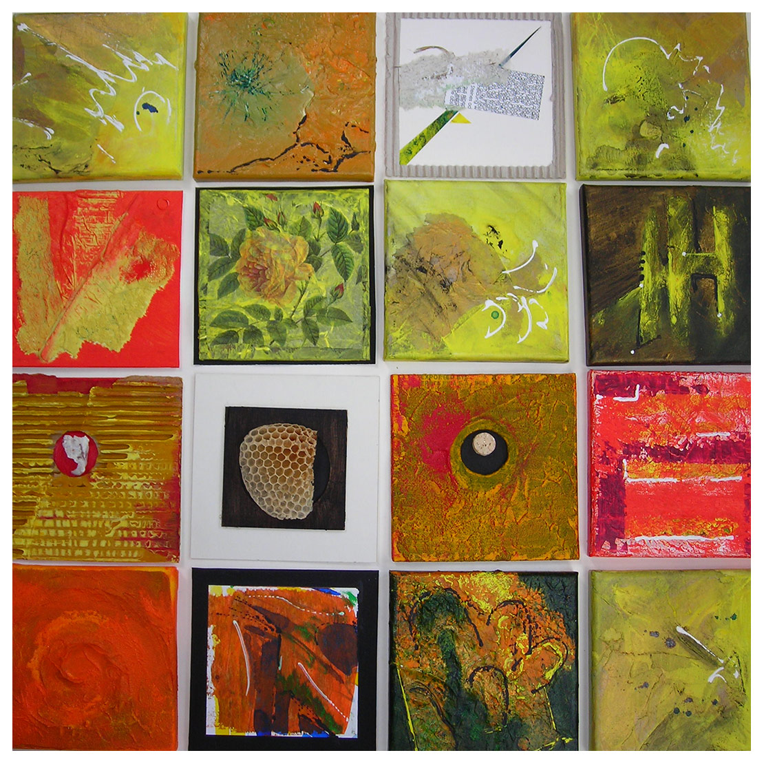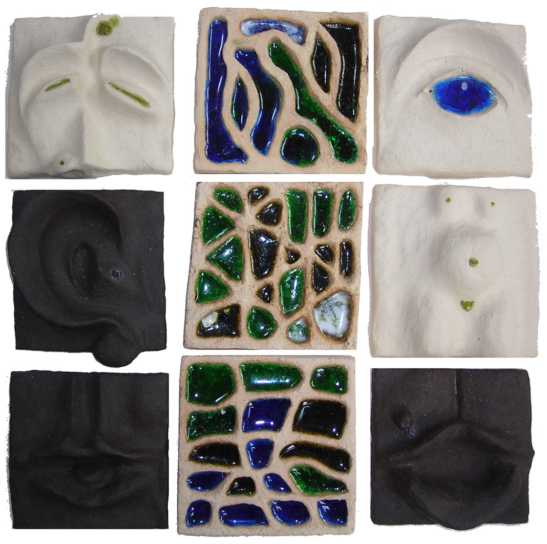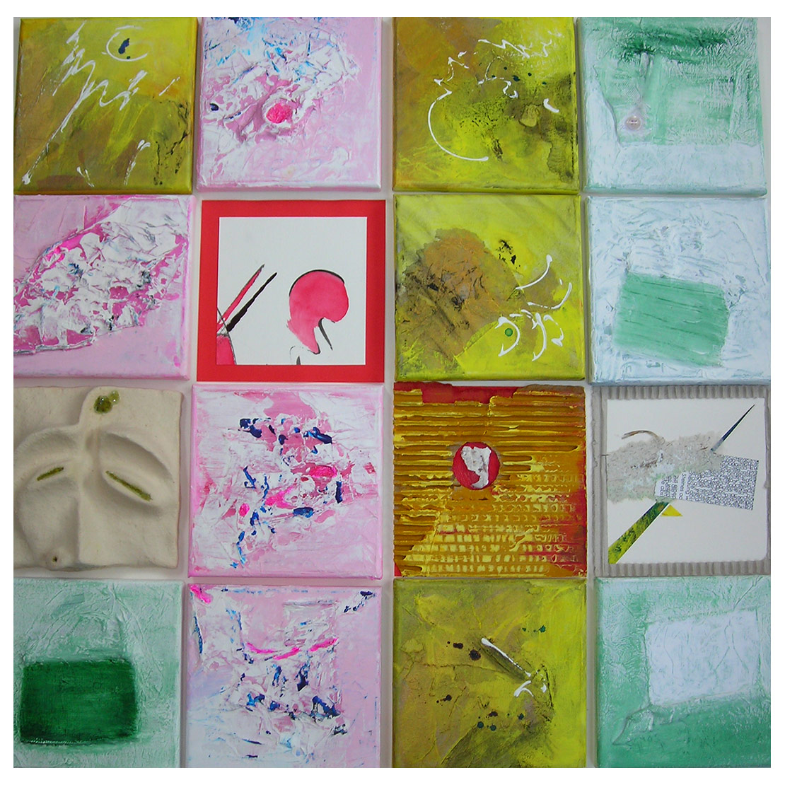 Tonkacheln, Papier- und Leinwandbilder, damit soll eine Wand gestaltet werden.