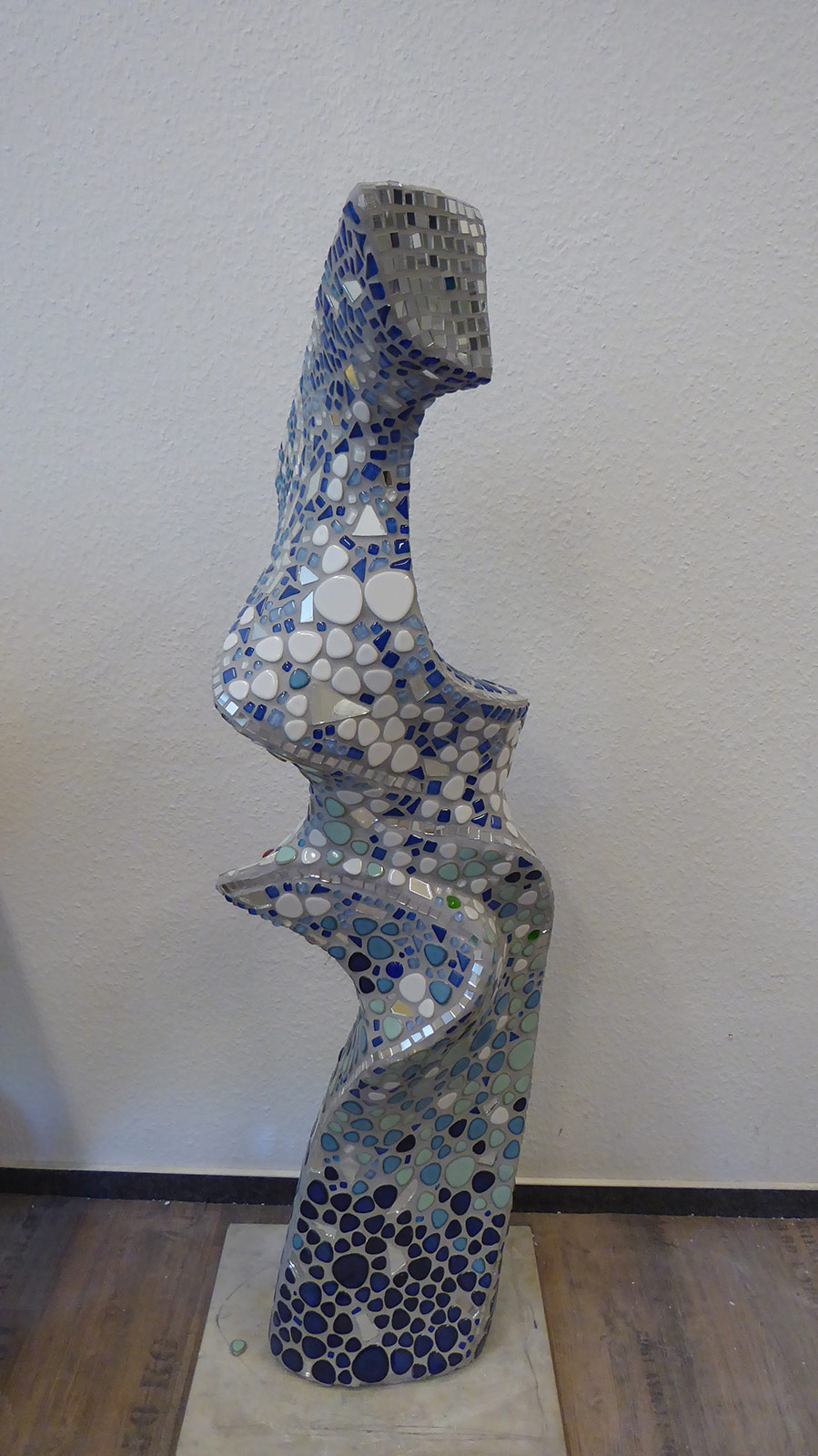 Betonfigur mit Mosaik verkleidet — Wandmosaik an der Hauswand Leverkusenstr. 13 — eine Gemeinschaftsarbeit von Sabine Dahl, Barbara Kayser, Beate Naujoks und Sabine Puchstein-Hollmann.